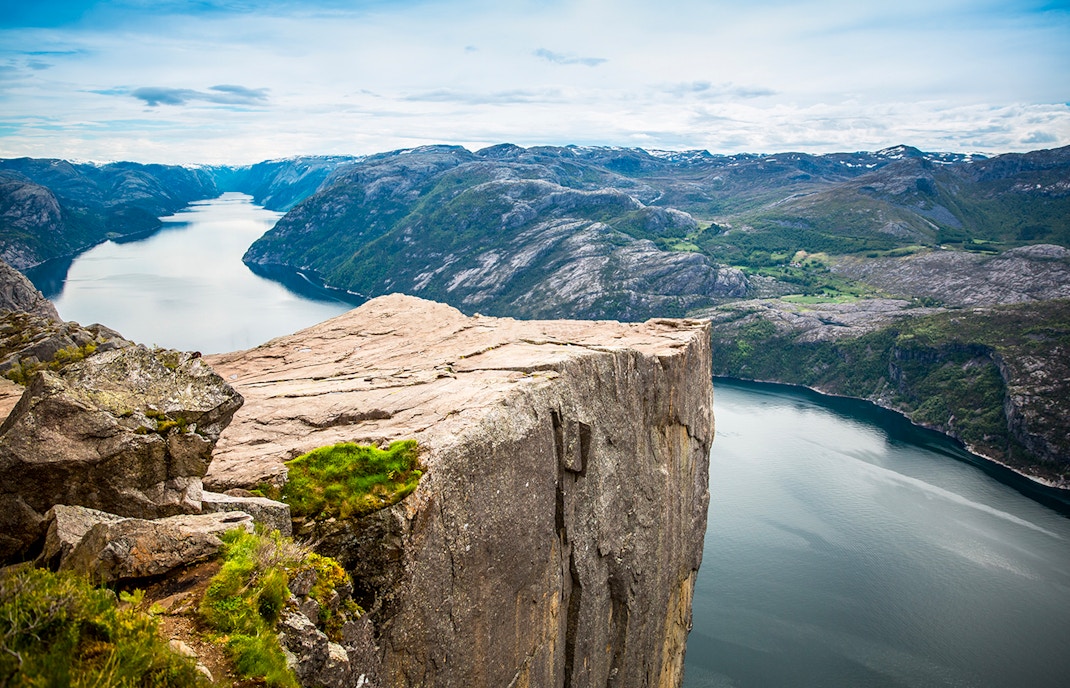 Diese flache Klippe ist das Kronjuwel des Lysefjords und ragt 604 Meter über das Wasser. Vom Fjord aus betrachtet, sieht es aus wie eine riesige steinerne Plattform, die kühn aus dem Berghang herausragt, perfekt quadratisch und scheinbar der Schwerkraft trotzend. Es ist einer der meistfotografierten Orte Norwegens.